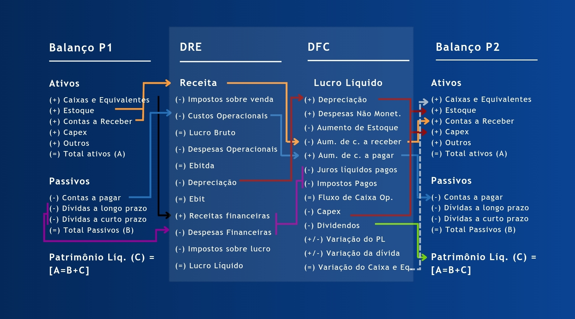 Todas as demonstrações conversam entre si, permitindo uma análise 360° do negócio, desde o resultado operacional até caixa, patrimônio e valor da empresa.