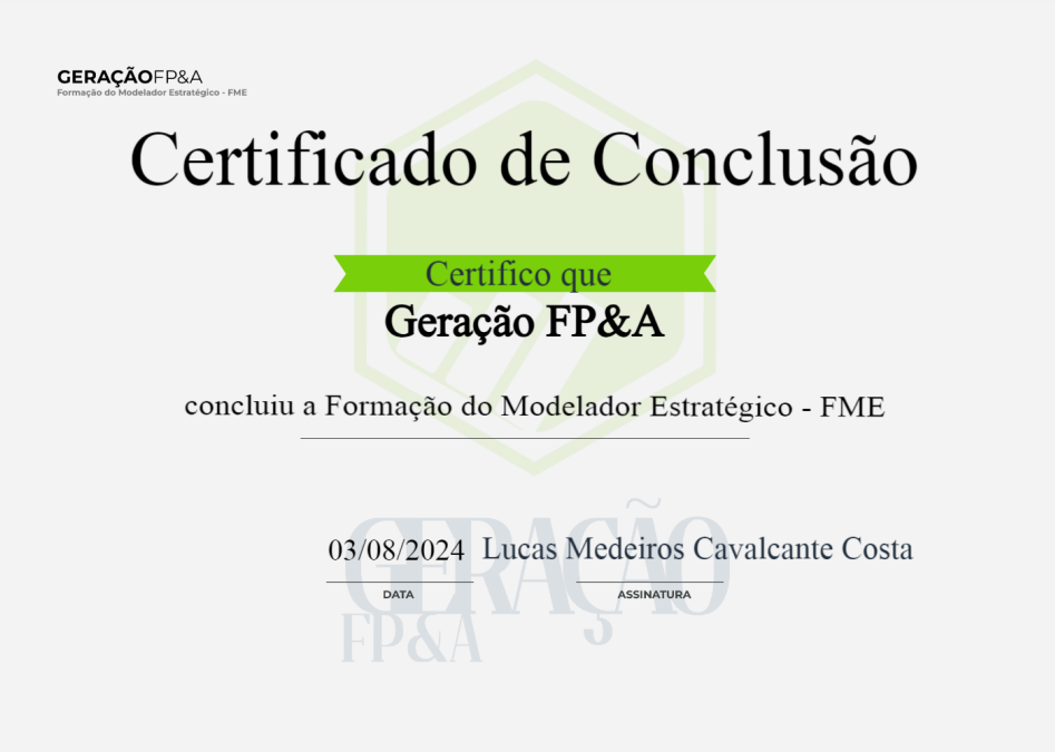 Lucas Lessa é empresário, Co-fundador da Geração FP&A e assessor empresarial com experiência na área de finanças e controladoria, com atuação em diversos projetos, nos setores alimentício, educação, varejo e indústria.
