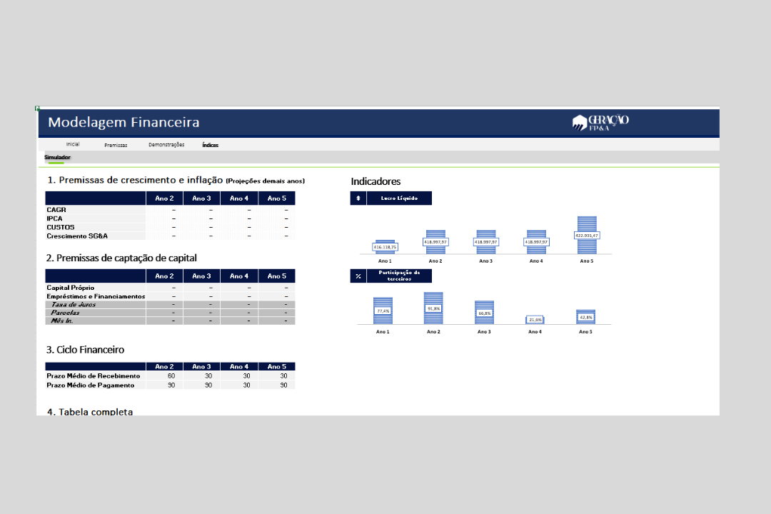 Descubra a poderosa e super planilha de modelagem financeira integrada, desenvolvida para atender às suas necessidades de modelar projetos financeiros simulando cenários.